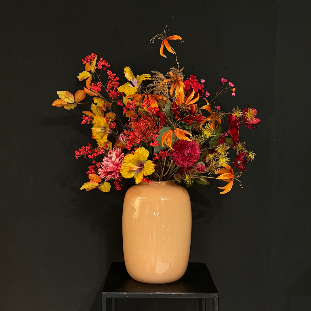 Dit prachtige herfstboeket straalt warmte en elefantie uit met zijn levendige mix van dieprode, oranje en gele bloemen. De rijke kleuren en dicerse texturen brengen de seizoenssfeer perfect tot leven in een stijlvolle vaas