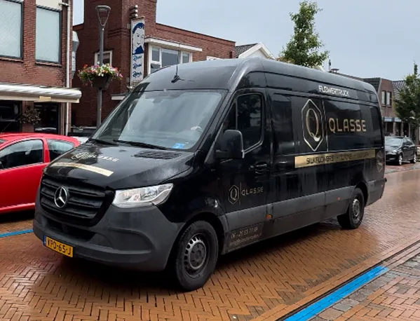 Onze flowertruck is een opvallende verschijning in Roden en omstreken. Deze is ook moeilijk te missen! De zwarte bestelbus heeft gouden tinten en bevat een levensgrote afbeelding van Qlasse-eigenaren Pascal en Nienke. Met deze wagen leveren we zijdebloemen- en planten bij jou thuis of op bedrijfslocaties.